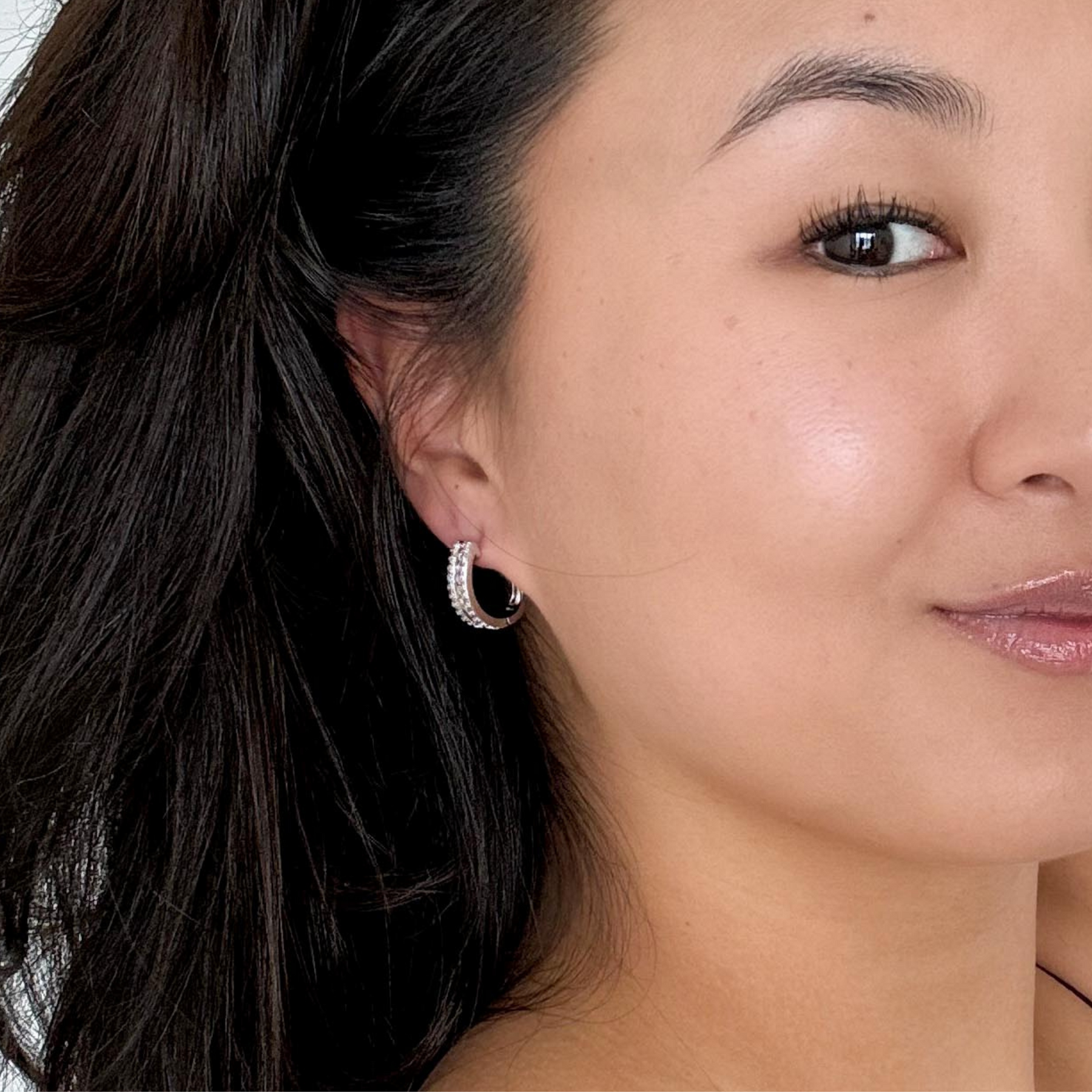 Crafted with 18k white gold plating, these hoop earrings radiate a lustrous allure that complements any attire. The focal point of these stunning silver earrings is dazzling square-cut Swarovski diamond crystals, exuding brilliance and grace. Surrounding it is a line of 52 accent stones, creating a breathtaking ensemble of shimmer and sparkle.