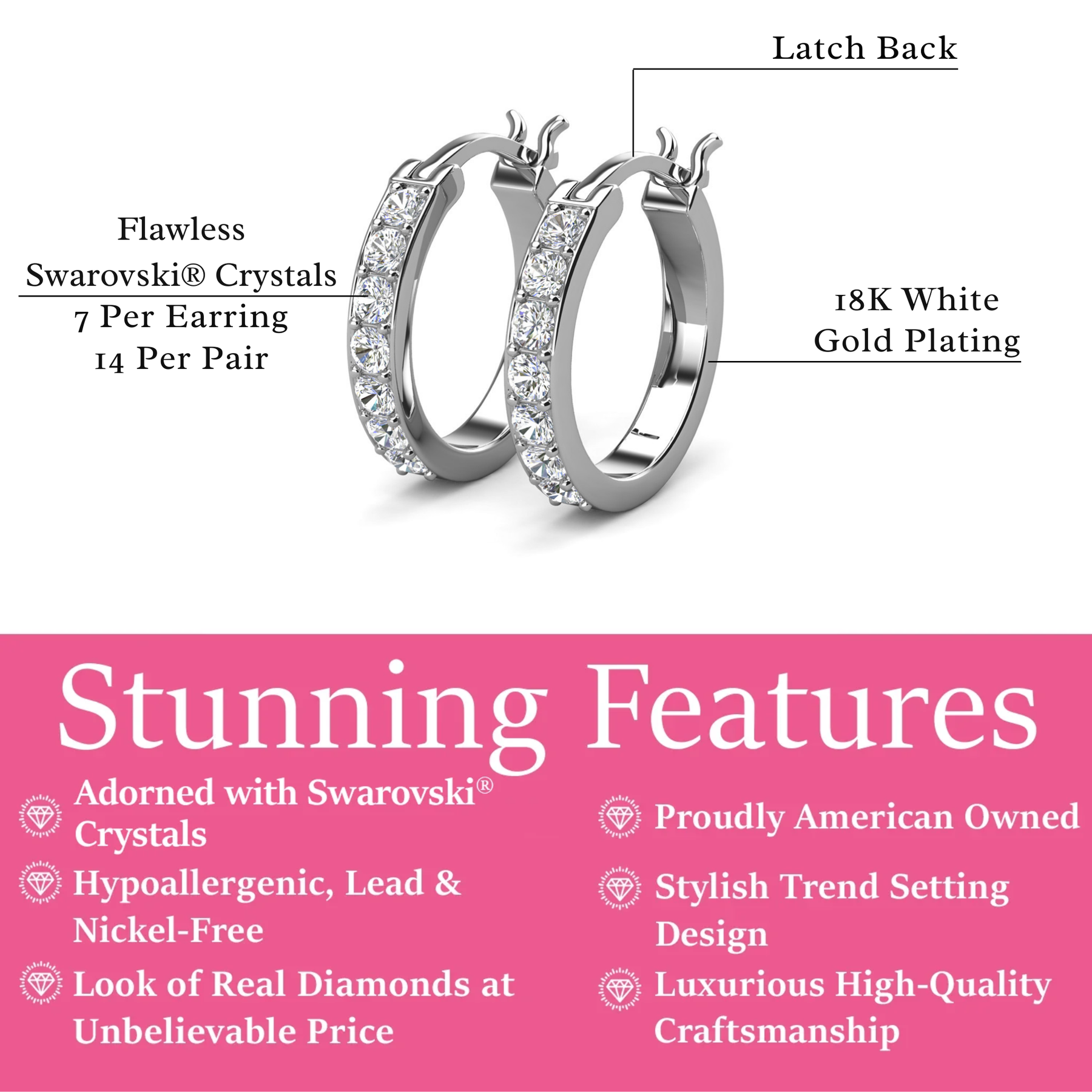 These stunning hoop earrings feature dazzling Swarovski crystals, adding a touch of elegance and sophistication to any ensemble.