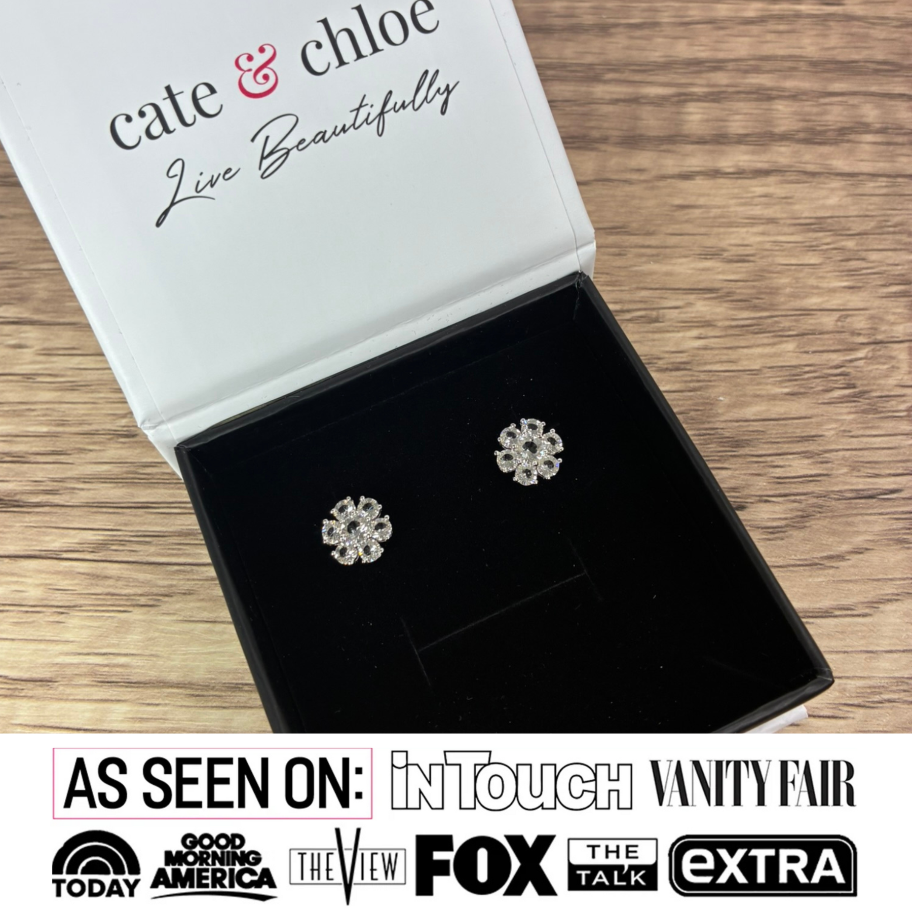 Charming, delicate, and sparkling with elegance, the Maggie 18k White Gold Plated Flower Stud Earrings bring a timeless touch to any look. Each stud features a beautifully crafted flower design adorned with brilliant Swarovski® crystals, catching the light and creating a radiant shimmer. Crafted from hypoallergenic brass and plated in luxurious 18k white gold, these earrings offer lasting comfort, durability, and effortless style. Presented in a stylish Cate & Chloe gift box, they make a thoughtful gift or a sparkling addition to your own jewelry collection.